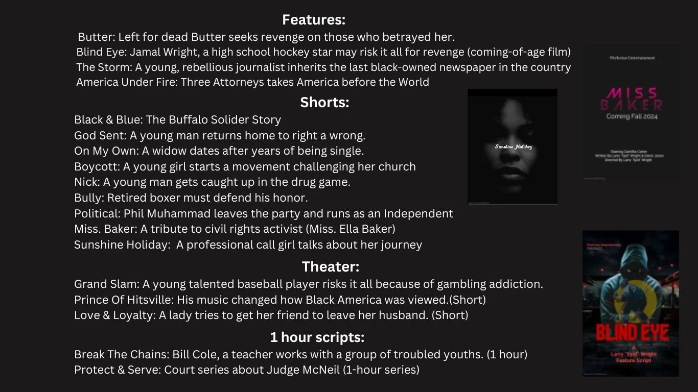 As a writer and filmmaker, my goal is to create projects that will capture the audience’s attention in a way that will set my projects apart from other writers and filmmakers through great writing, directing, and producing. My scripts are shorts, features, and theatrical plays that have been in countless film festivals since 2005.